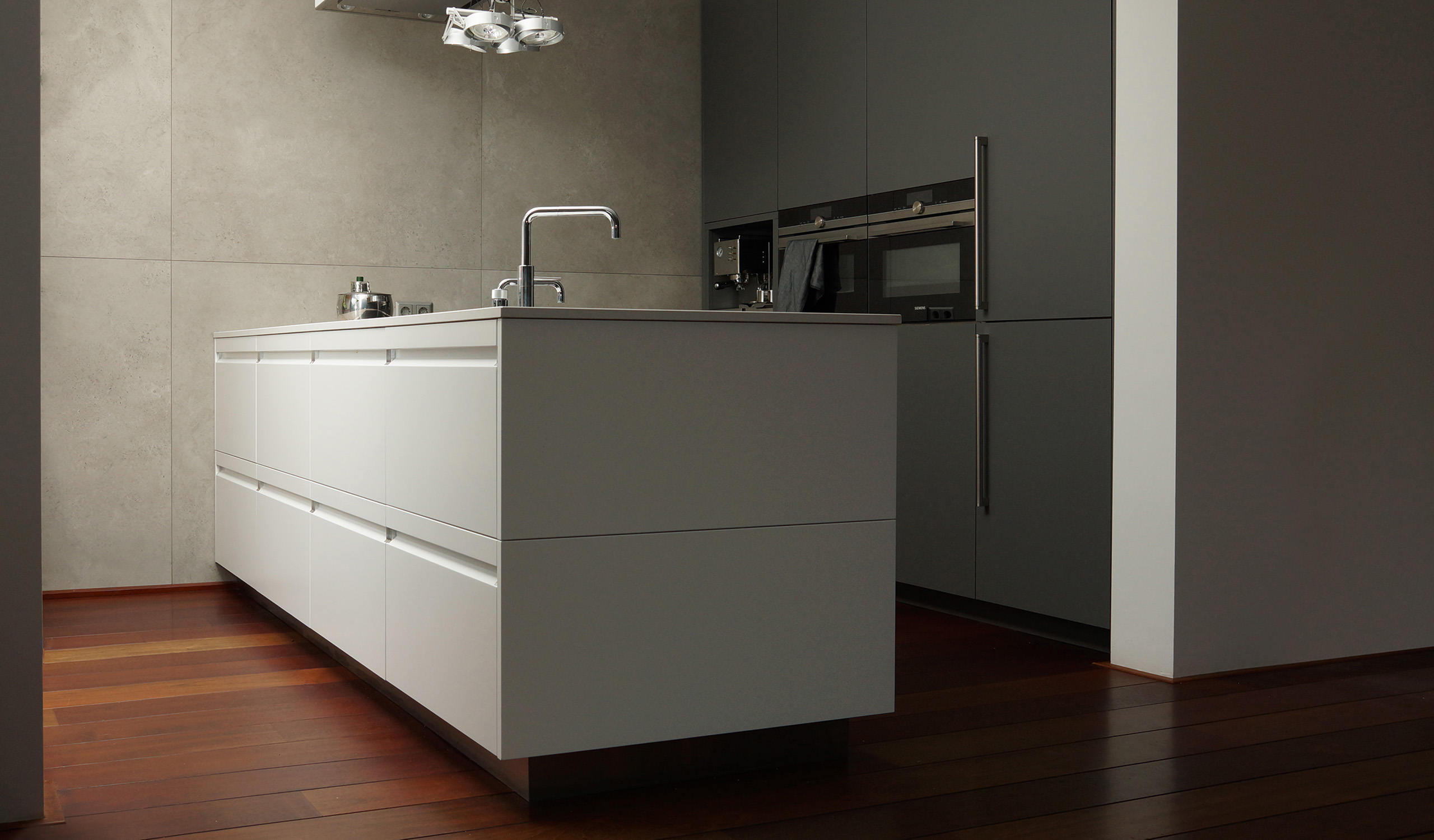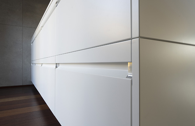 During the initial phase of a project, we perform a market and competition analysis. We discovered that most design kitchens now offer ‘handle-less’ fronts for kitchen drawers.