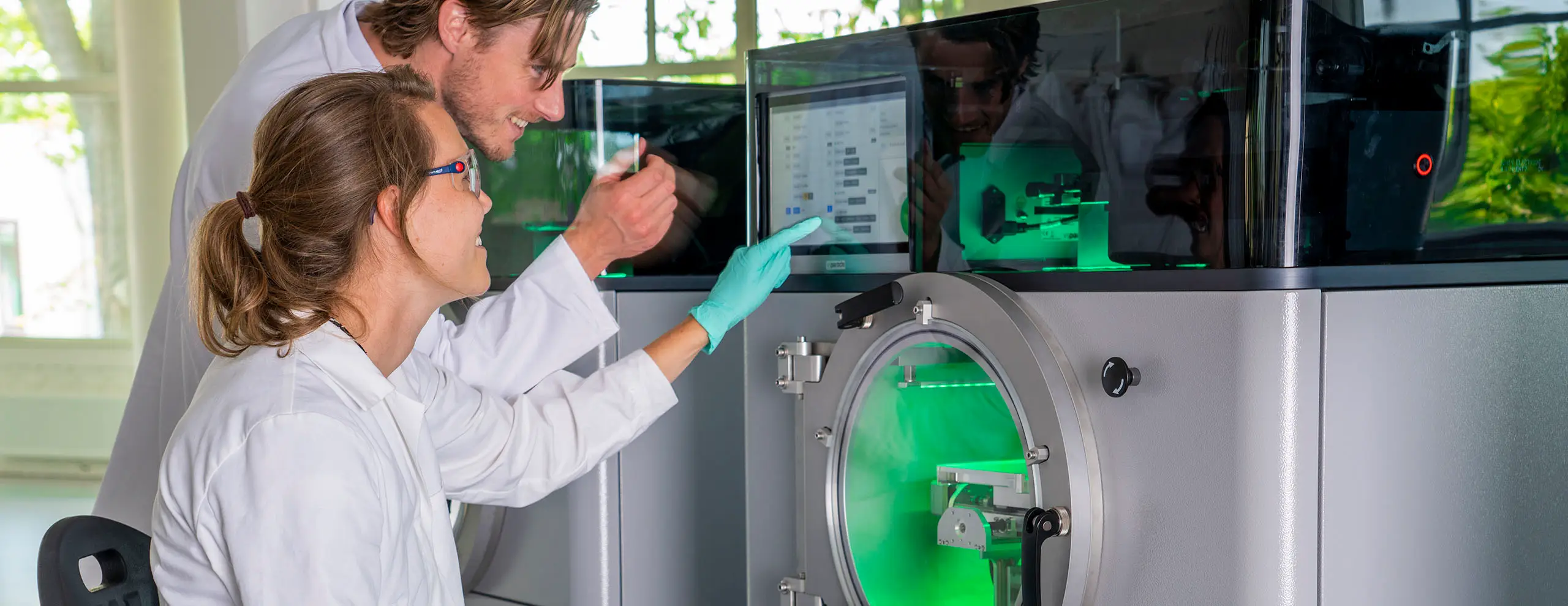 npk design heeft onderzocht hoe de bestaande labopstelling omgezet kon worden in een apparaat met een hoog bedieningsgemak en een passende uitstraling. Uitdaging hierbij was de integratie van de grote, ronde vacuümtrommel en de twee deeltjesgeneratoren die beiden makkelijk toegankelijk moesten blijven. Markant in het ontwerp zijn de half doorzichtige kap boven op de machine en de sterk afgeronde hoeken die het apparaat een geïntegreerde en solide uitstraling geven.