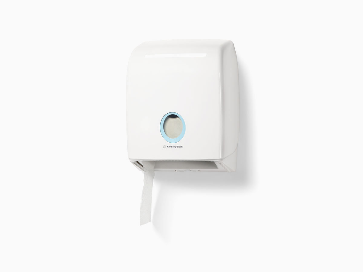Herkenbaar design met specifieke kenmerken als afgeronde hoeken en een high-gloss uitstraling, versterkt de branding van Kimberly Clark. AQUARIUS* heeft dit allemaal. Een aantrekkelijke buitenkant is één aspect van het ontwerp. Een tweede aspect is om het ontwerp te verbinden met de eisen voor hygiëne, functionaliteit en betrouwbaarheid. Het strakke ontwerp zonder randen waar vuil of stof zich kunnen ophopen, zorgt ervoor dat de dispensers snel en eenvoudig schoon te houden zijn. En dat bespaart tijd (One-Wipe-Clean principe).